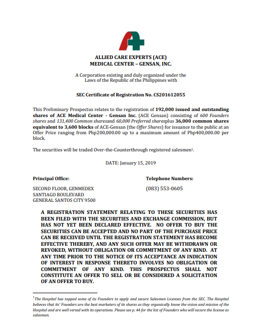 Allied Care Experts Medical Center – Gensan, Inc. (ACE MEDICAL CENTER - GENSAN) is a stock corporation duly organized under the laws of the Republic of the Philippines on June 10, 2016. ACE Gensan originally had an authorized capital stock of One Hundred Twenty Million Pesos (120,000,000.00) divided into Six Hundred (600) Founder Shares,Fifty-Nine Thousand Four Hundred (59,400) Common Shares and Sixty Thousand (60,000) Preferred Shares, all with a par value of One Thousand Pesos (P1,000.00) per share.